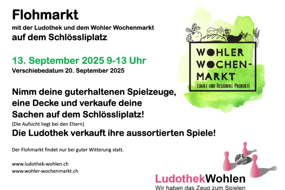 Die Ludothek kommt mit einem Flohmarkt für Spielsachen an den Wochenmarkt. Kaufe und verkaufe Spielsachen.